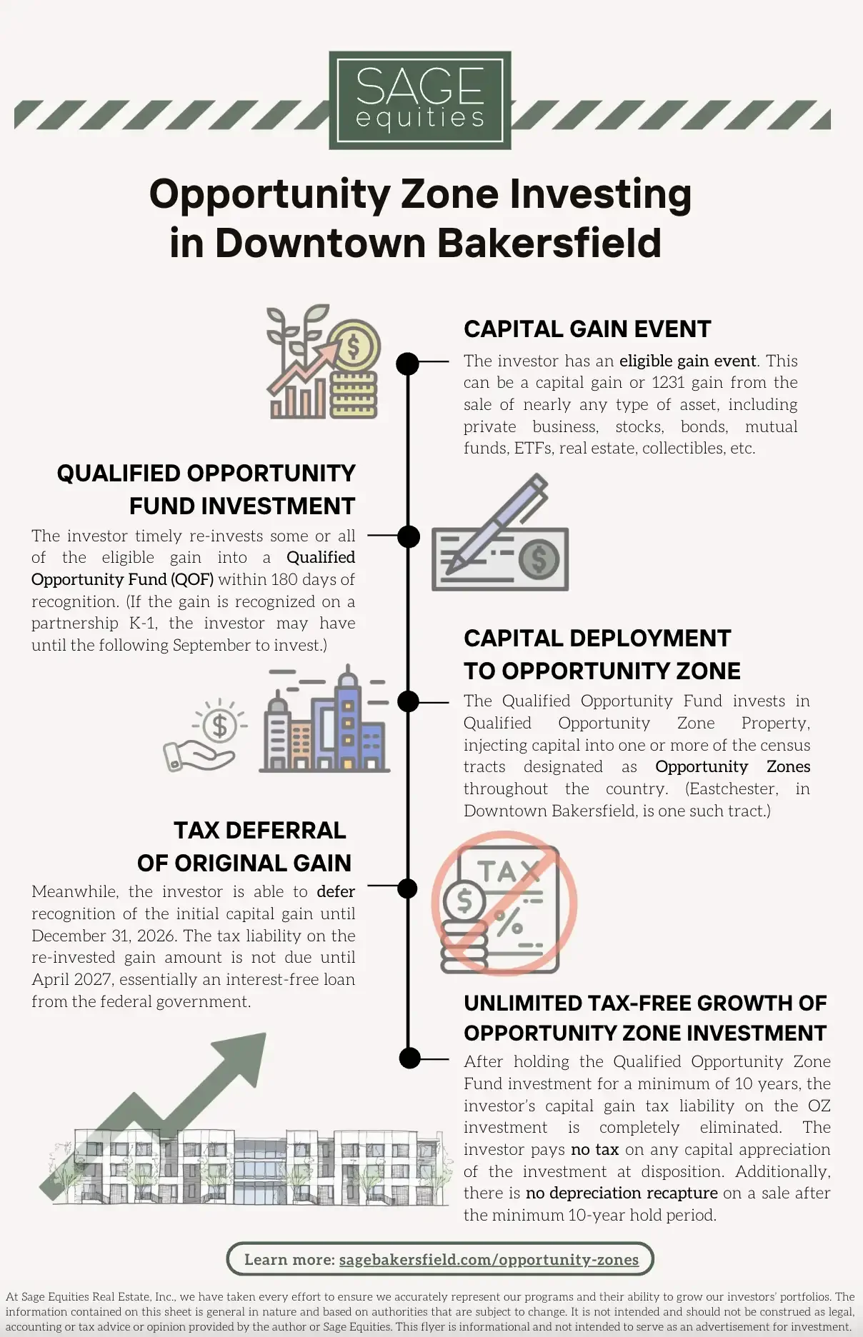 Created through the Tax Cuts and Jobs Act passed in December 2017, Opportunity Zones offer investors the ability to place realized capital gains into real estate projects and businesses in qualified geographical areas. Sage is able to offer these significant, once-in-a-lifetime tax benefits to investors since we develop ground-up multifamily residential structures located in Qualified Opportunity Zones in Downtown Bakersfield, California.